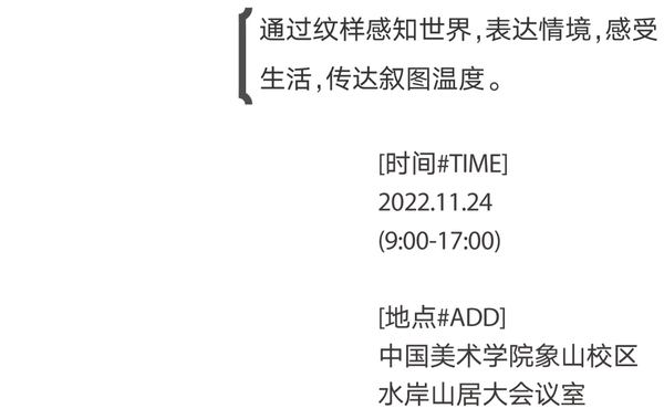 作为2022中国美术学院设计周及国际创意纹样设计大赛(ICPDC2022)的活动之一,本次研讨会旨在通过对观纹样的多元视角,探讨在元宇宙的畅想和人工智能的迭代背景下,用艺术的创造力与设计的创新力在纹样中探索生活和心境。纹样作为一种与人类相依相伴创新元素,不断被赋予从“文化传承”到“文化创新”的动力转向,创作紧扣时代脉搏,创新形式语言,展现设计的系统性与完整性。大会希望通过讨论未来纹样上的形式演变,进行深度思考和学术探讨。