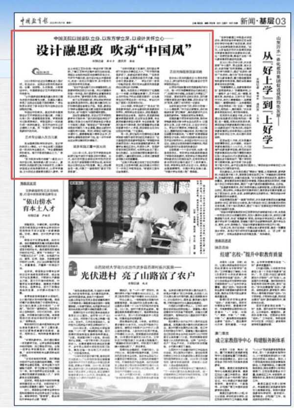 2020年5月,教育部印发《高等学校课程思政建设指导纲要》,全面部署课程思政建设,各地高校纷纷掀起课程思政建设浪潮。设计艺术学院坚持立足视觉艺术东方学,开拓思路将专业课程与思政育人有机融通,在引导学生关注东方文化、建立创新传播意识的基础上,以传授专业知识的哲学思想、逻辑体系和艺术价值为载体,融盐于水、润物无声,使社会主义核心价值观入脑入心,培养青年学子的审美追求、文化理想和家国情怀,涌现出一系列课程思政优秀成果。3月21日《中国教育报》以《设计融思政 吹动‘中国风’》为题对设计艺术学院课程思政建设进行专题报道。