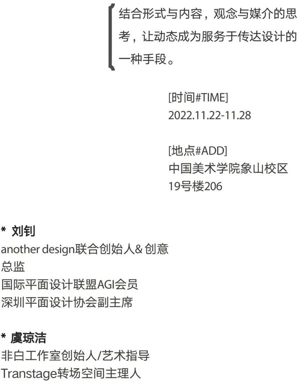 以another design 和 transwhite studio的实际项目为基础,带领大家从不同的角度认知motion design 与dynamic design的区别;结合形式与内容,观念与媒介的思考,让动态成为服务于传达设计的一种手段。