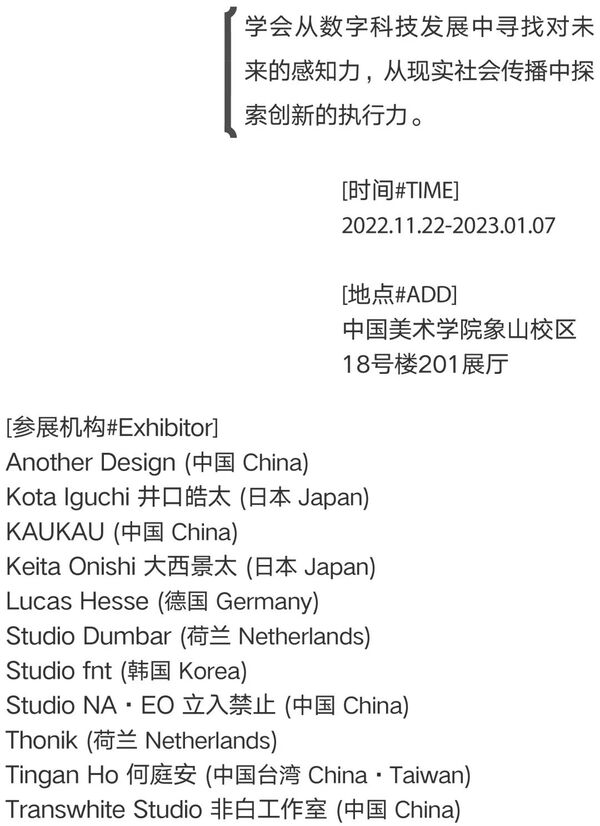 本展览聚焦国际前沿动态视觉设计领域,邀请了来自国内外11个设计机构的著名设计师,展现他们在视觉设计领域中动态设计的探索,关注信息承载下的媒介塑造和新工具应用,发现设计师背后的动态思维模式和创作方法,以及动态设计在社会传播中所承担的作用。展览在设计艺术学院,举办旨在为教学提供更多的专业思考和教学路径,通过与参展设计师对话,结合动态设计工作坊教学,能更好地了解动态设计思维与创作方法,从数字科技发展中寻找对未来的感知力,从现实社会传播中探索创新的执行力。