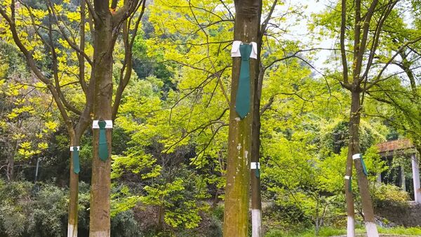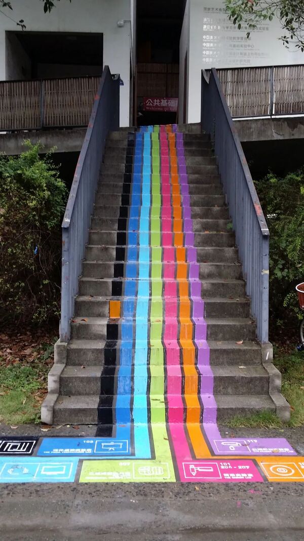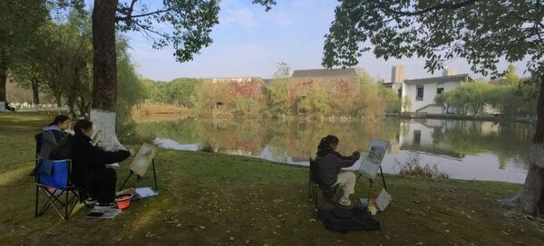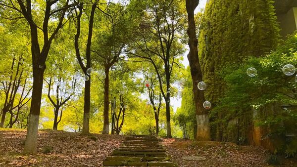 被象山校区之美氤氲与滋养是幸运的,来吧,随我来吧……让我们一起在校园里邂逅“美人鱼”雕塑;一起放逐身心、追随彩虹,在楼梯与坡道上嬉戏与迷藏(图15);一起将稍纵即逝的春天收藏在透明泡泡里,看它们在新绿里遨游(图16,图17);一起来给小树打一条绿色领带(图18),道一声“Hello!树先生!”与他们一起站好队列,在山水之间吟唱一曲青泠泠的歌……