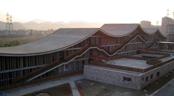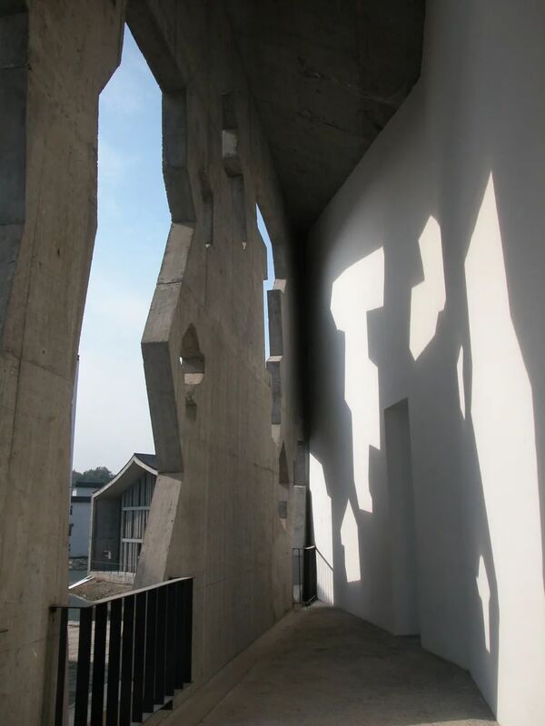 然后,当从浙江各地拆房现场回收来的、不同年代的700多万片旧砖、旧瓦、碎瓷片聚集于此时,王澍老师便恍如一位高明的指挥家,指引着那蕴藏于心底的韵律缓缓流淌而出,这韵律又深深地感染了这些旧砖、旧瓦、碎瓷片,它们和着这韵律呼吸、律动、翩翩起舞……