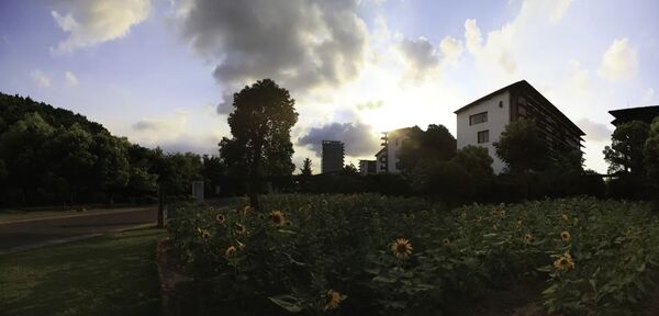 转一个弯,眼前豁然开朗,你见到的不是大片、大片的绿茵草坪,而是一望无垠的油菜花、向日葵、燕麦、玉米……一年四季,在阳光下,绚烂而辉煌。在这里,所谓绿化,不过是农人亲手种植的、最原生态的农作物,我们的身心就这么被一年四季的各种农事所环绕与交织,在春华秋实之中,饱享那朴实的、乡野的气息,深深地吸入,静静地感受,完完全全地融入大自然的怀抱。