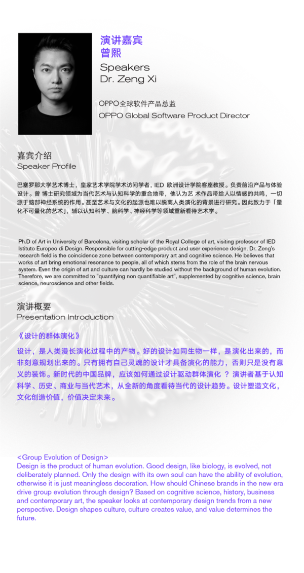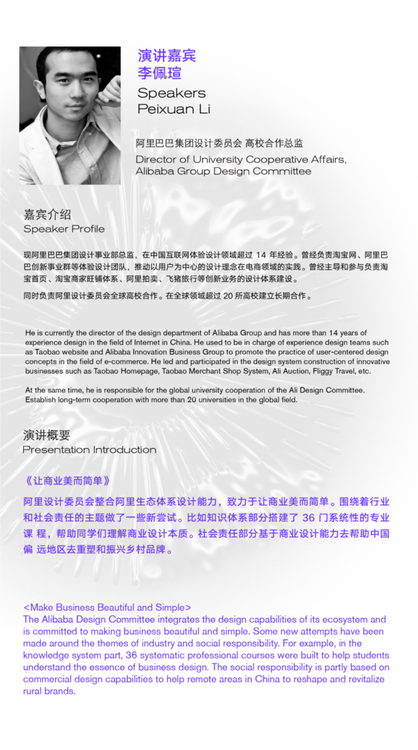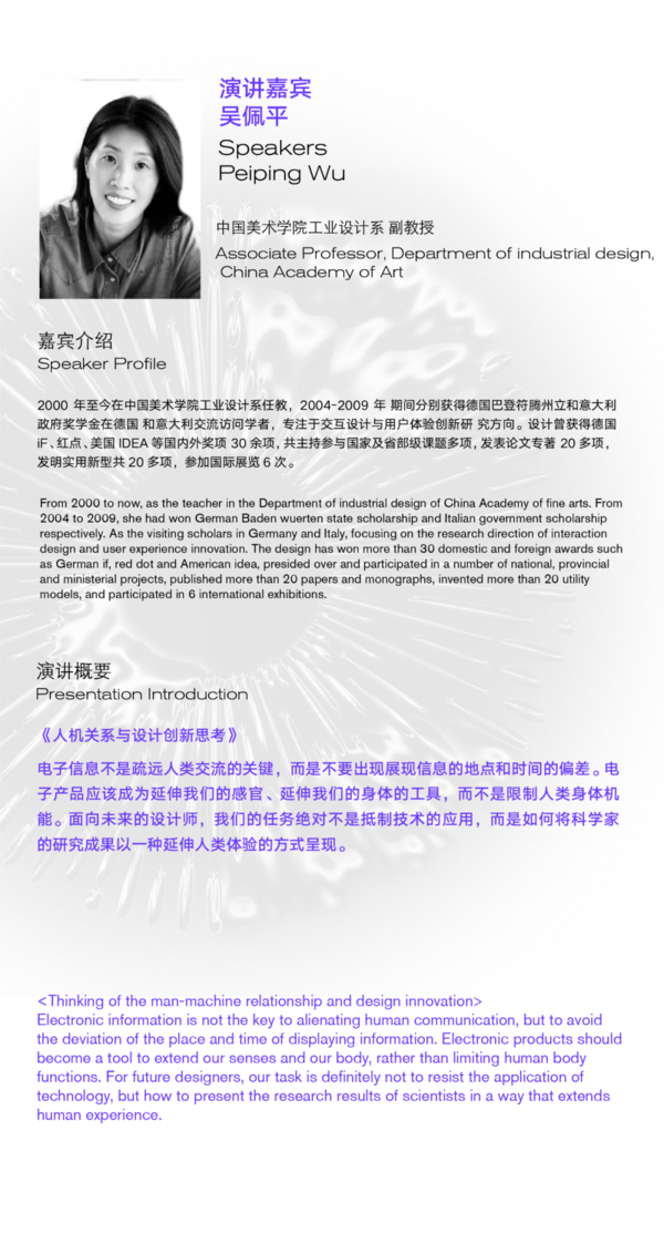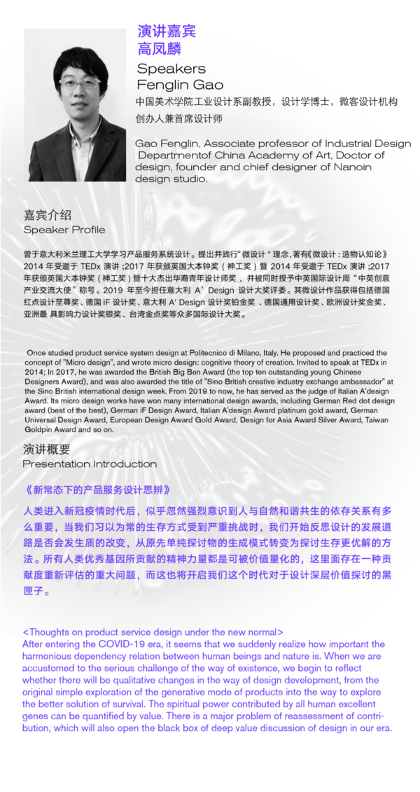 While conducting school-enterprise cooperation, academic innovation, and cutting-edge experience communication with creators, the design week will also launch dialogues between enterprise experts, and academics to discuss information about the industry demands and expectations for the cultivation of innovative talents and different forms of cooperation in current situation. And through the communication with all parties of conference industry, creators and researchers, students are encouraged to open up practical channels, discuss speculative design methods, and understand driving the landing of feasible products as the role of innovative designer to meet global trends and challenges.