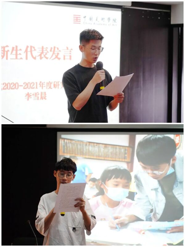 来自中国美术学院2020-2021研究生支教团的两名新生代表李雪晨、马远宁以他们的支教经历,与硕博新生们分享了成长心路和感悟体会,以青春色彩诠释了“行健、居敬、会通、履远”的校训精神。李雪晨同学向在场研究生发出了坚定地追逐梦想、勇敢地担负使命的号召,马远宁则呼吁同学们一起静心夯实专业技能、提高文化涵养,将“美”融入自己的血脉,肩负起作为国美人的使命担当。