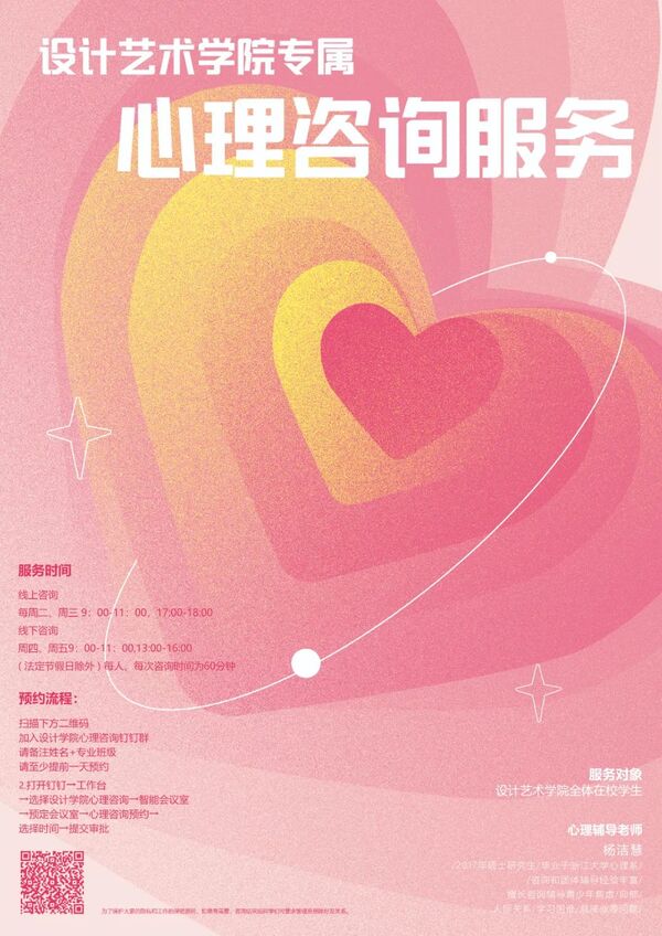 为了更好地给同学们提供心理陪伴,让同学们在成长的过程中得到更专业的心理支持,特为同学们开通专属于设计艺术学院的线上心理咨询服务。