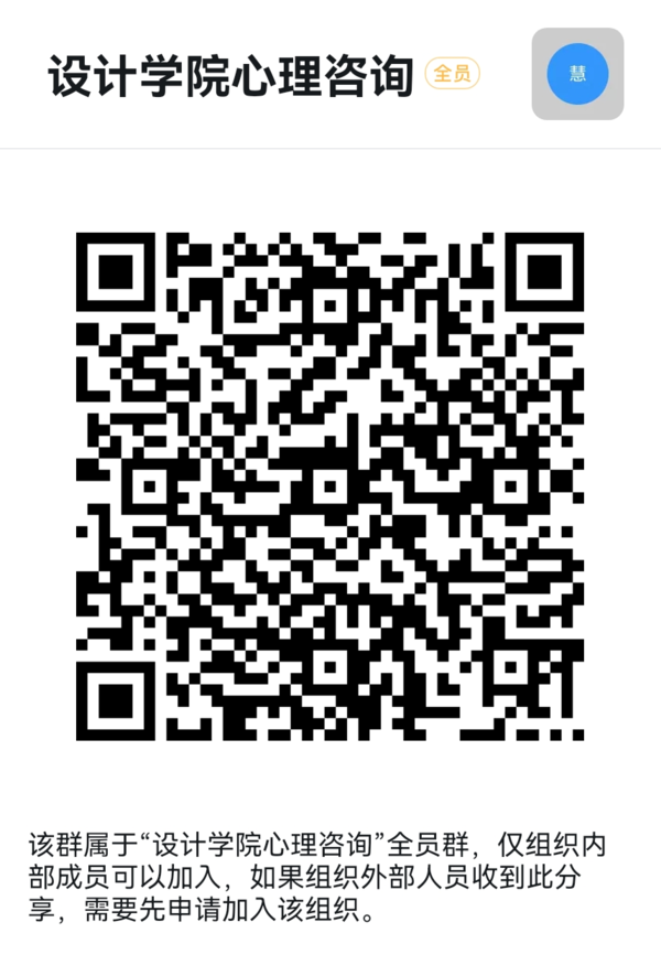 1.扫描下方二维码加入设计学院心理咨询钉钉群,备注姓名+专业班级。请至少提前一天预约。