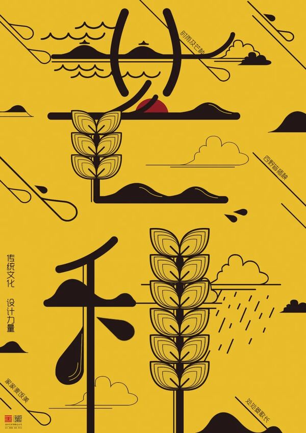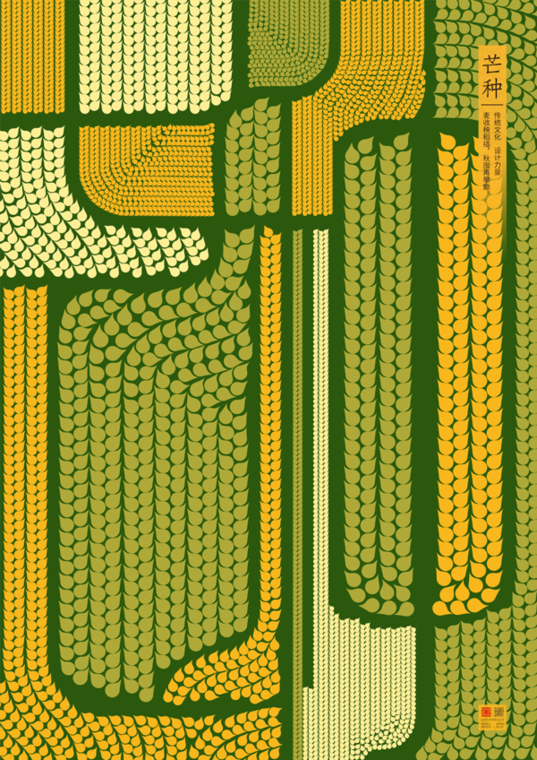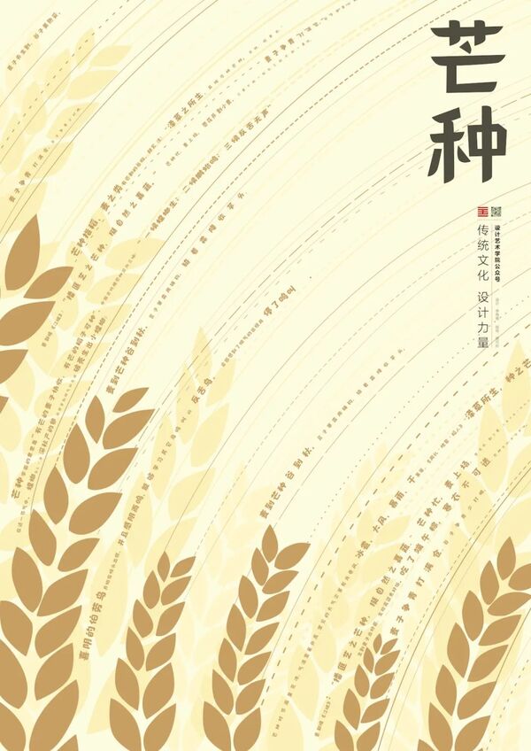 芒种是一个耕种忙碌的节气,民间也称其为“忙种”,农谚“芒种忙、忙着种”说的就是这个道理。这个时节,正是南方种稻与北方收麦之时。此时的麦芒与麦皮已经变为灿灿金黄,海报创作便以小麦的形态为主,以虚实不一的线构成细长的麦芒,麦粒麦芒整体呈弧状弯曲如同田野中夏风轻拂而过、轻快自然。