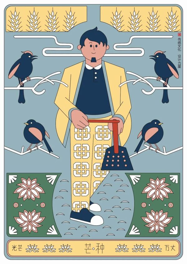 “芒种”又叫“忙种”,农家此时正忙着收获谷类,播洒种子。此时伯劳鸟因阴气微生而啼叫,反舌鸟因阴气微生而收声。金丝梅、玉簪花、荷花等花也在芒种节气开放着,海报的创作便基于此。