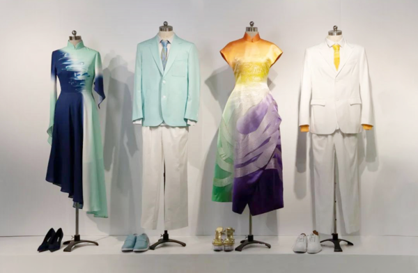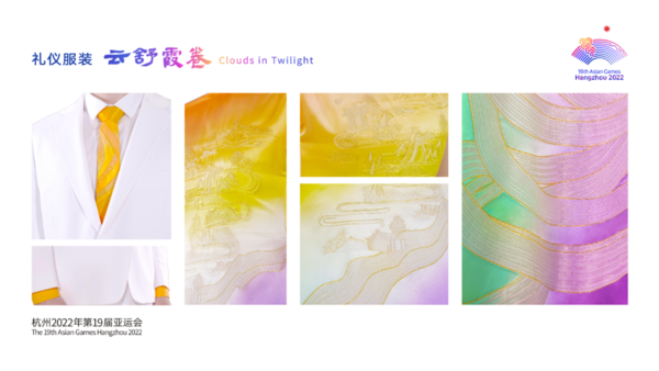 杭州亚运会礼仪服装设计主题是“云舒霞卷”,寓意姿态万千,色彩斑斓。