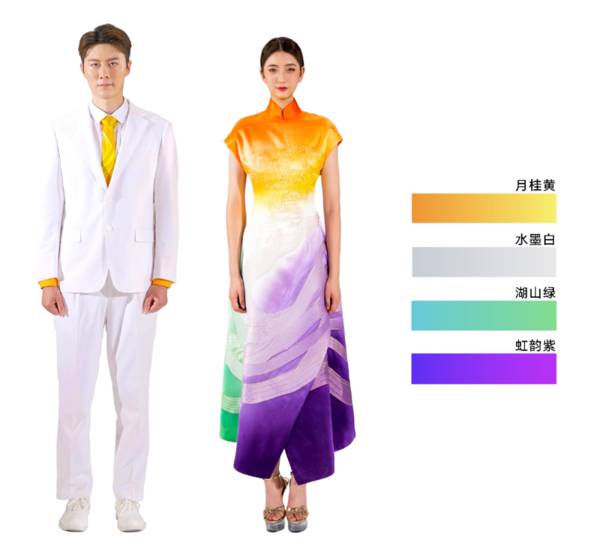 颁奖礼仪服装色彩来源于亚运色彩“虹韵紫、月桂黄、水墨白、湖山绿”,月桂黄从上至下渐变,湖山绿、虹韵紫从左至右渐变,水墨白与其他颜色相互交融;设计元素来源于人文历史景观、钱塘奔腾潮涌、亚运竞技赛道,构建起华美丰富的图案;造型风格中西兼容,采用简单立领、宽阔肩部、收腰及斜摆裙的造型,其中托盘礼仪人员为短款,引导员为长款。