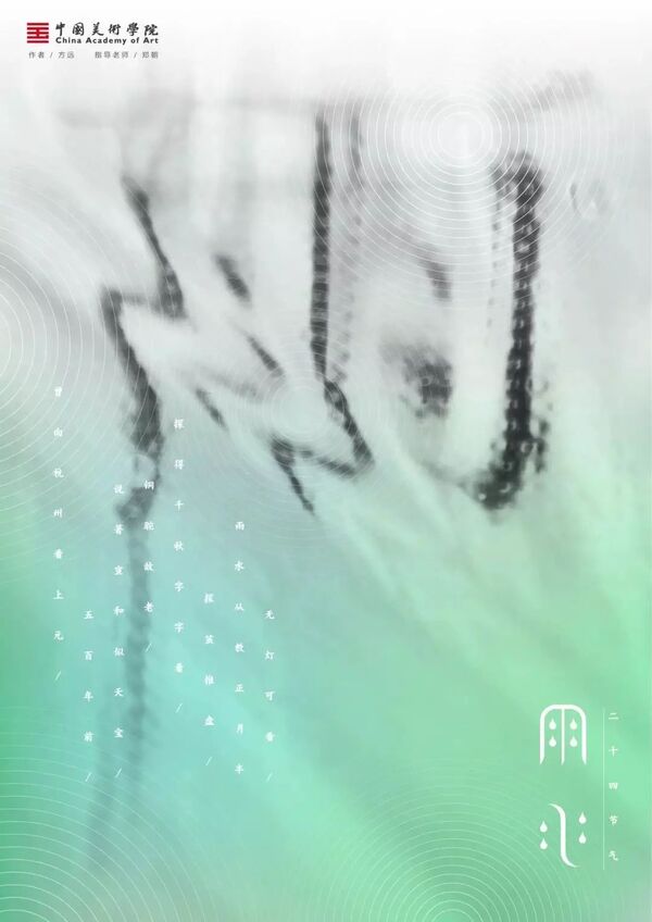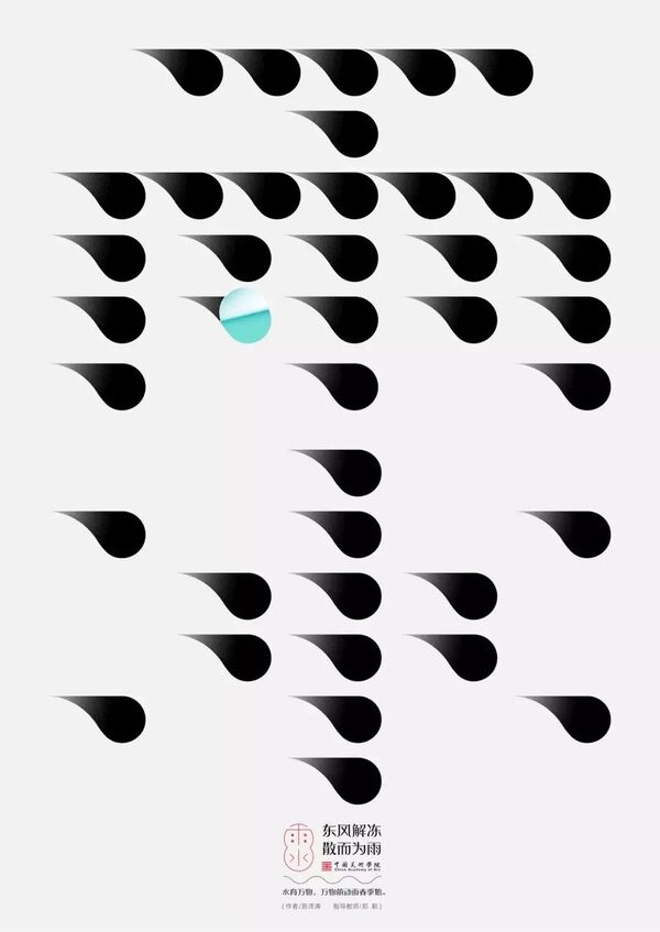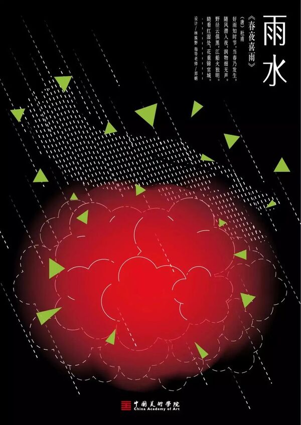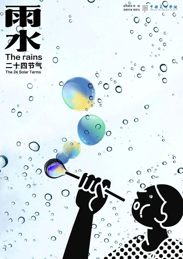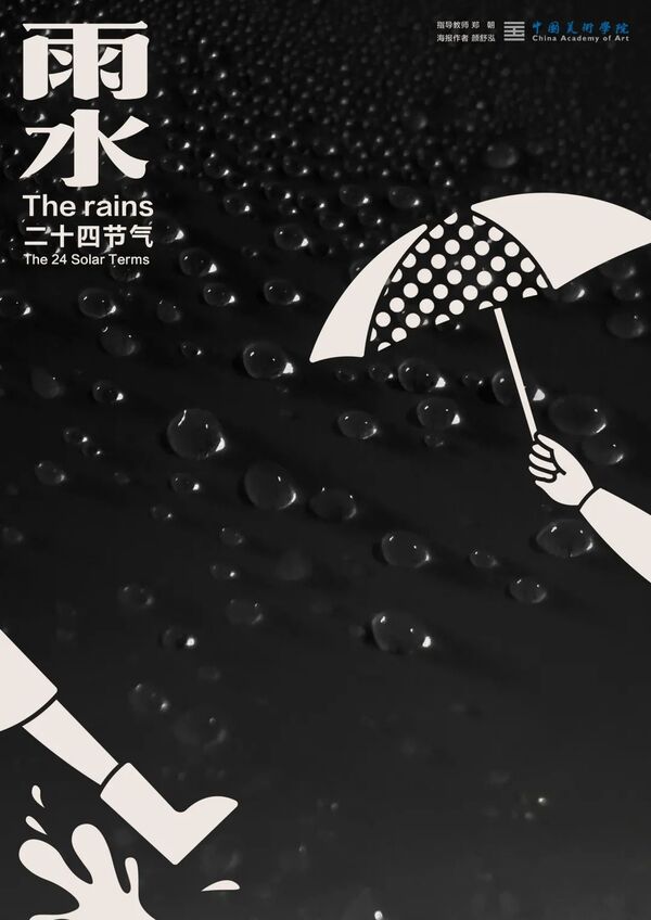 雨水,是二十四节气之第2个节气。斗指壬;太阳到达黄经330°;每年公历2月18-20日交节。雨水节气的含义是降雨开始,降雨量级多以小雨或毛毛细雨为主。俗话说“春雨贵如油”,适宜的降水对农作物的生长很重要,它是农耕文化对于节令的反映。进入雨水节气,我国北方地区尚未有春天气息,南方大多数地方则是春意盎然,一幅早春的景象。当古老的传统文化与极富创造性思维的设计相融合,会碰撞出怎样的火花呢?值此春回大地之际,设计艺术学院的师生共同创作了「雨水」系列海报,为雨水时节增添了艺术气息。