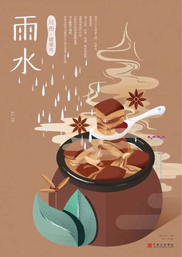 这是从民俗角度出发进行的设计。罐罐肉是川西一带雨水节气典型的食物,是一份子女对父母的孝心。用插图的形式将罐罐肉和所需食材的图形进行设计,加上氤氲缭绕的烟雾来烘托温暖的氛围。