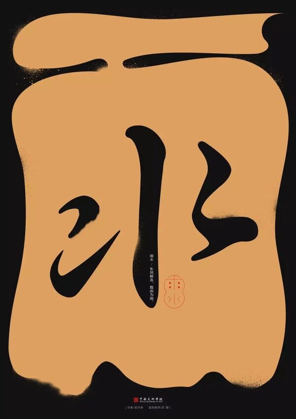 以最基础最简单的传统汉字笔画中的“点”,表达雨点、水滴概念,构成节气“雨水”二字,字体图形如飘扬雨点,喻“雨水”节气:东风解冻,散而为雨,春雨东风拂过,最是一年春好处。
