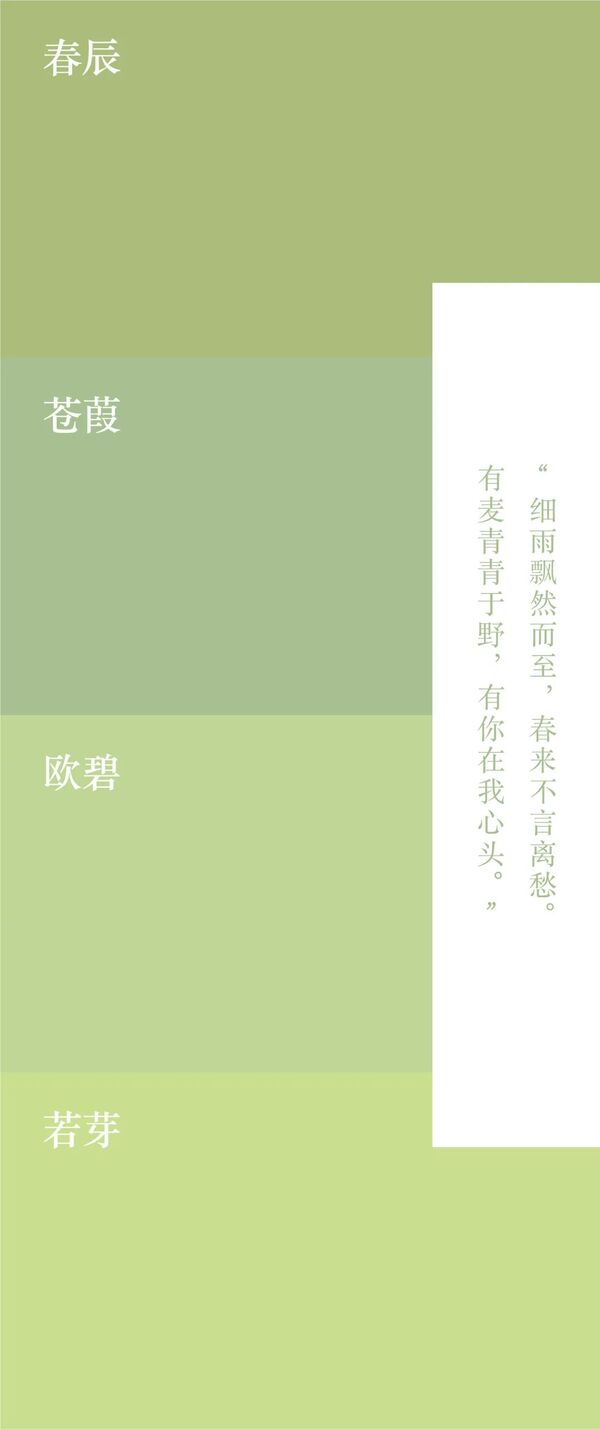 春天的雨水给人一种绵密的感觉,图中雨水的两个字由多条细线组成,同时这些线条代表了雨水降落时的轨迹。背景的渐变则代表雨水从天空到地面降落的地点变换。