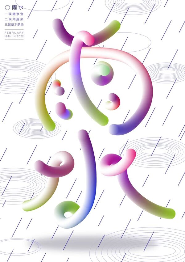 冬风解冻,化而为雨。雨水节气前后,冬天悄悄过去,万物开始萌动,灵动又温暖的春天即将到来。对“雨水”二字做字体设计,用丰富的色彩和俏皮的笔画表现雨水节气前后充足的降水与春天的生机勃勃。