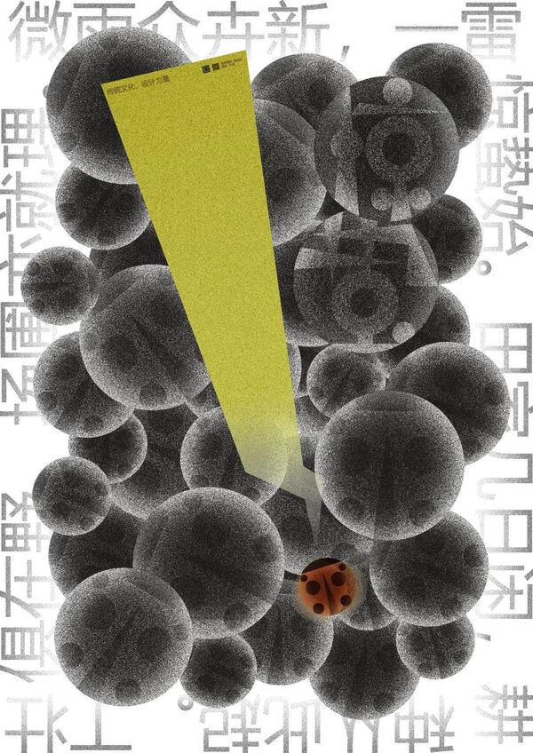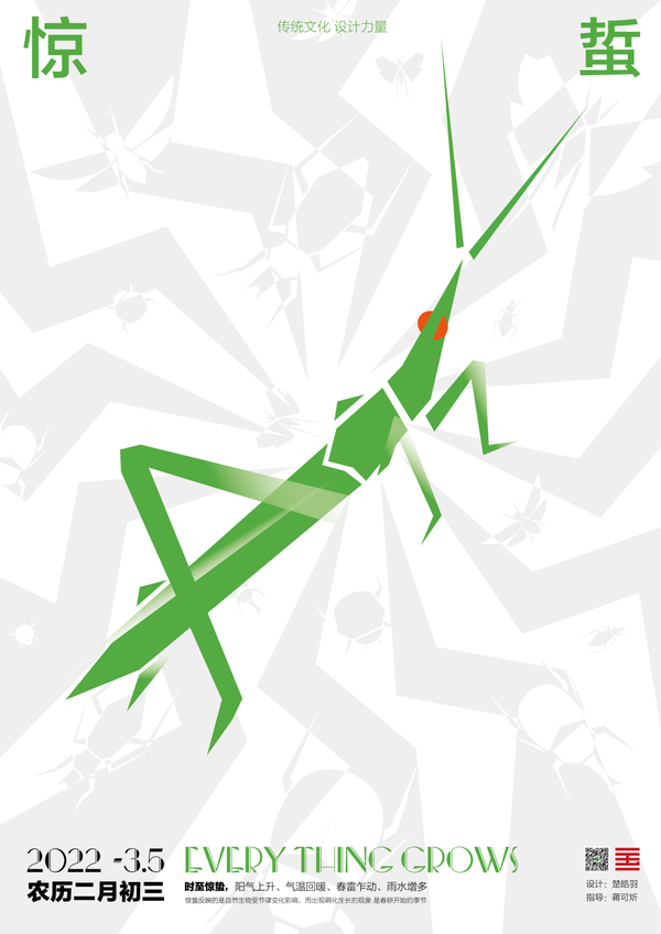 惊蛰时节,春气萌动,万物复苏。海报灵感来自于民间谚语“春雷惊百虫”,惊蛰时节,春雷始鸣,惊醒蛰伏于地下越冬的蛰虫。