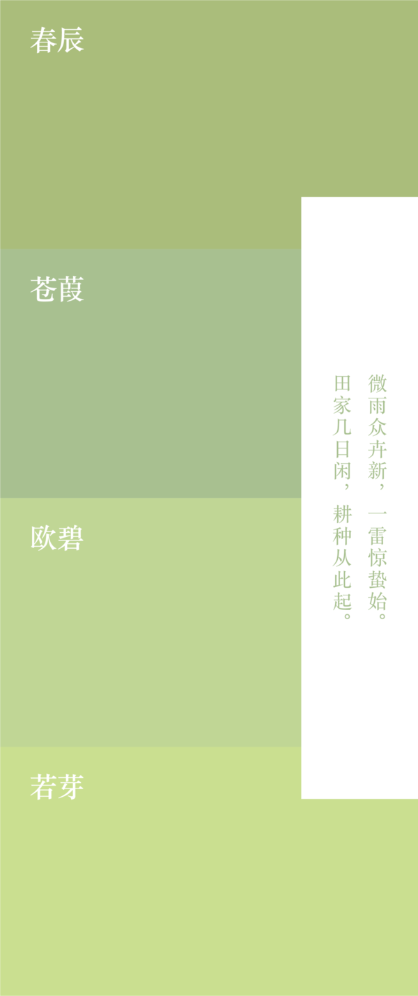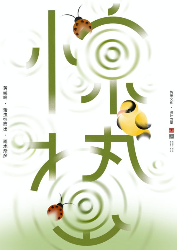 “惊蛰”古称"启蛰",是二十四节气中的第3个节气。此海报设计灵感源于其雨水渐多的气候特征,运用正圆扩散的涟漪构成主题的两个大字,黄鹂瓢虫的形象表示“黄鹂鸣”“蛰虫惊而出”的自然现象。暗示天气回暖,人们开启农耕生活。