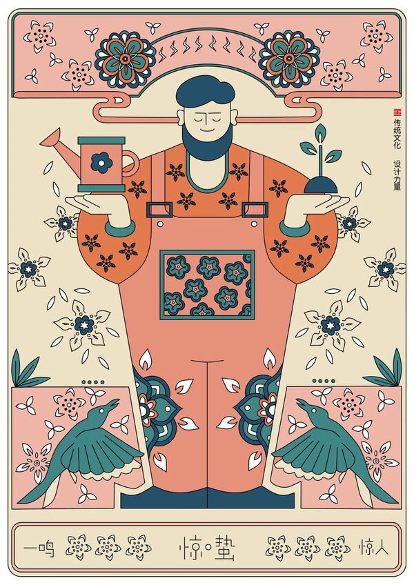 惊蛰时期,非常适宜植树浇水,海报的主体人物体现的便是这一农事活动。在这段时间黄鹂开始鸣叫,动物开始求偶,桃花、梨花、蔷薇竞相开放。海报文字设计内容为“一鸣惊人”,通过吉祥语的添加,给看到的人以积极的心理暗示。