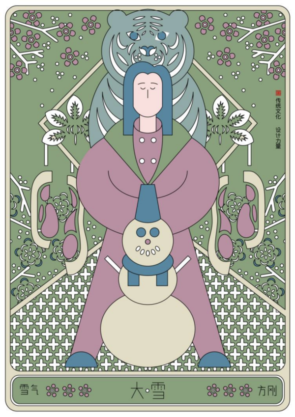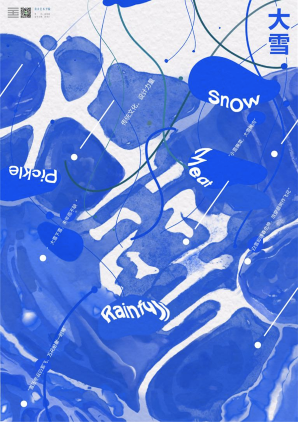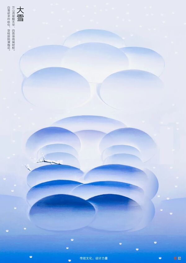 设计说明:对“大雪”二字进行设计,用堆叠的圆片表现大雪时节降雪量增多,地面、树杈积满的厚重雪层,用背景蓝色的渐变体现天地银装素裹,“瑞白浮枝头”的美景。积雪也使地表与作物不受冬季寒冷干燥的强风侵扰,在开春融雪时滋润大地。
