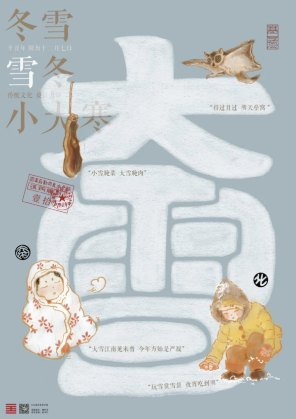 设计说明:大雪时节,元吴澄撰《月令七十二候集解》:“至此而雪盛也。”北方的雪大约是下过几场了,南方的气温也降过几次,冷冷的冰雨在这个时节尤多。想到白的雪与雾蓝色天空,想到新腌的腊肉,想到每一个渴望“裹紧小被子”美美入睡的夜晚,想到玩雪的小朋友冻红的脸蛋,想到小学课文里出现过“得过且过”的复齿鼯鼠——它就是大雪物候之“一候鹖鴠不鸣”的“鹖鴠”,寒号鸟。在意自然的轮回,在意民俗的流传,在意习以为常的美好。