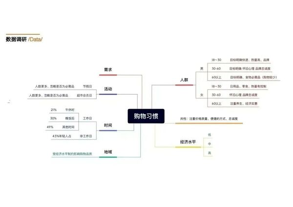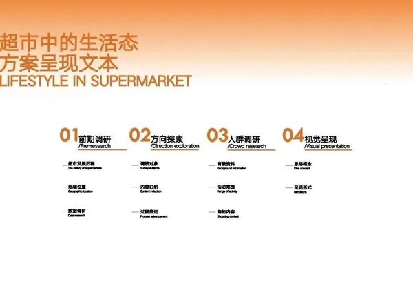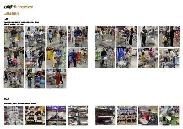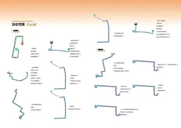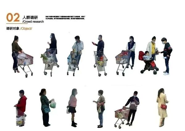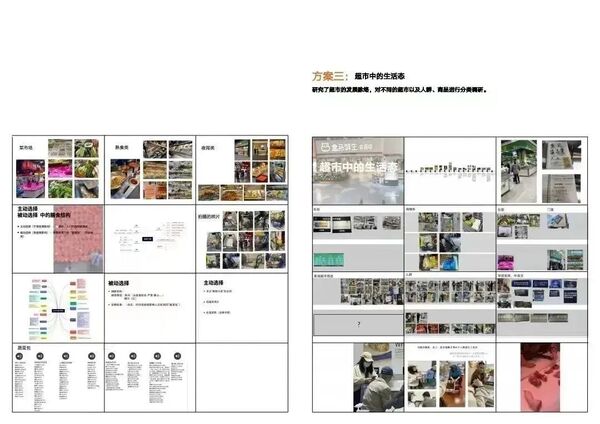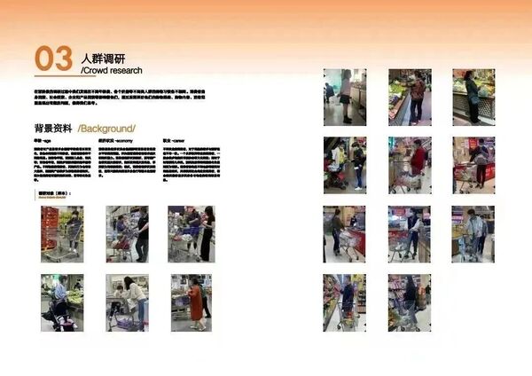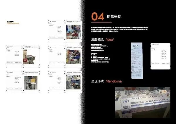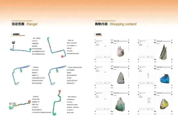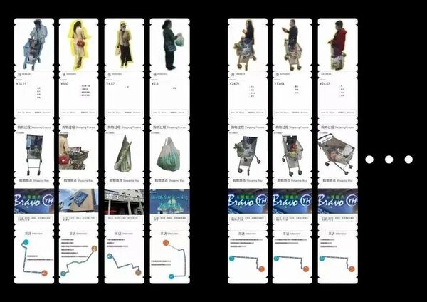 通过调研有关超市的大量的数据,包括从空间与时间的对照,使作品最终呈现从人群分类进行视觉数据上的可视化以及对比。运用大量信息梳理以及样本采访得出可视化的结论,了解到当下不同年龄段人群都有着不同的有关超市的生活态。从购物小票的调研整理、每个样本人群的采访、活动路线、购物方式及购物过程四个方面的信息调研进行可视化处理,并从中得到结论:极少数的老年人出现在高端超市并活动于距家较近的超市;中年人活动范围较广,但大部分购买目的是实惠,所以连锁超市与生活超市会经常光顾;年轻人的活动范围是最不统一的,他们出于喜好会去很远的地方,并且他们消费水平也是参差不齐,即每个样本都具有其特殊性。