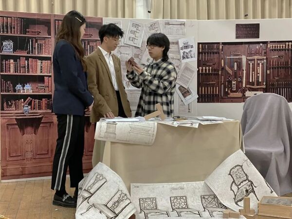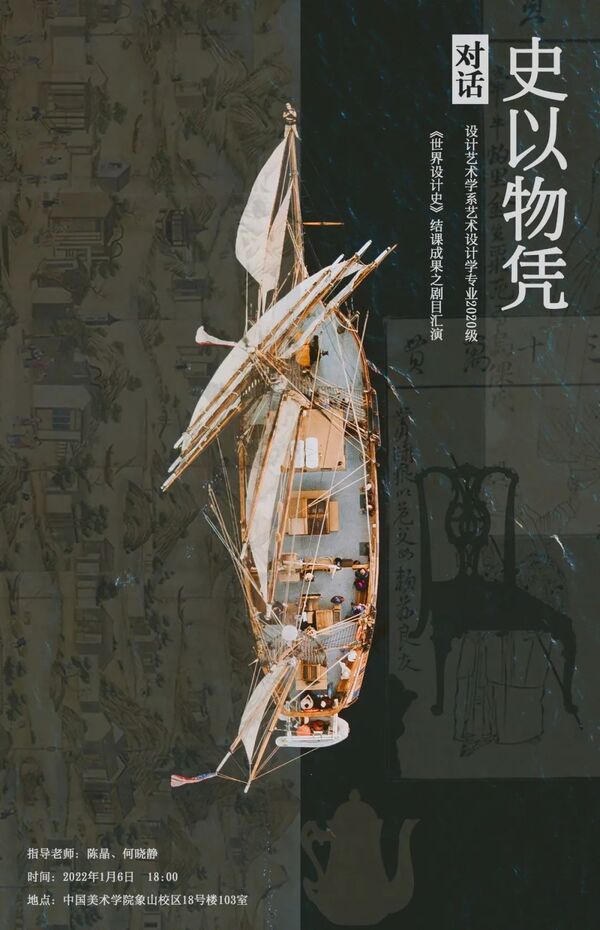 “史以物凭”结课剧目演出是设计史课程经过教学改革后衍生出的具有特色的结课形式之一。本轮演出中,四组学生分别沿着14—19世纪海上丝绸之路,探寻设计史上的中西交流,在器物生产、审美习惯、思想文化等方面进行跨时空对话。学生们根据设计史实合理改编并撰写剧本,通过排演剧目来生动立体地展现设计故事,并亲手制作相关舞美道具。这种剧目演出的形式突破了静态的教学展示,转向动态的交流模式,使得课程真正达到了灵活贯通、学以致用的目的。通过剧目演出这种综合的艺术表现形式,学生系统性地学习并掌握了设计器物、设计事件、设计思想、设计人物等多重要素的整体性的研究方法和路径,取得了良好的教学效果。目前,“史以物凭”结课剧目演出已经成功举办了五届,成为设计艺术学系的品牌活动。