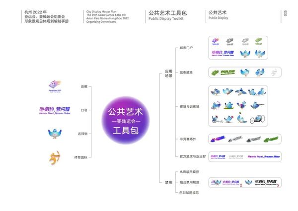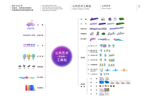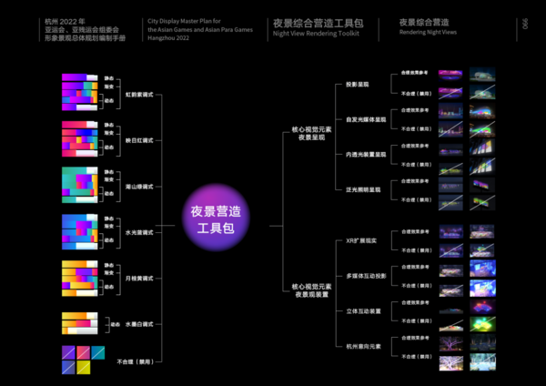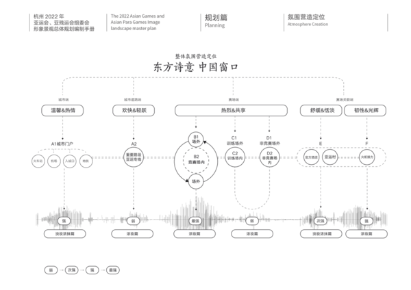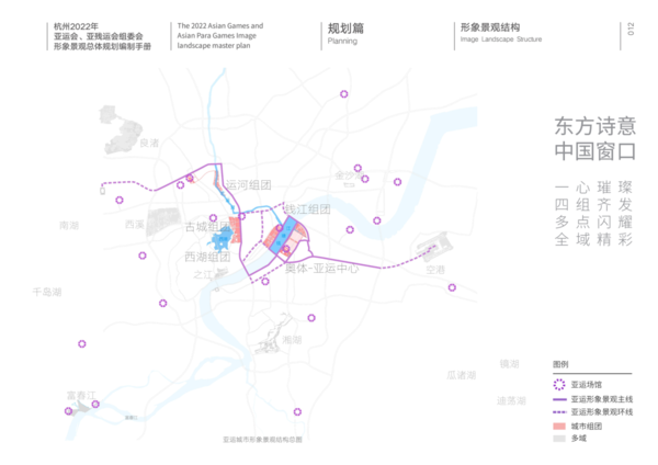 通过理念篇、规划篇、工具包篇与实施篇的整体规划,科学统筹,形成相对集中且主题明确、重点突出的形象景观规划导则,针对布局策略、强度、分级、分期实施等提出指导性、选择性、约束性原则。区域包含城市端、赛场端、赛场关联端,并规划与设计了视觉形象、公共艺术、夜景营造工具包的基本标准与应用规范,贯融城市门户、亚运专线等城市重要节点与赛场馆、训练馆、非竞赛场、亚运村、官方酒店、火炬接力等场域。