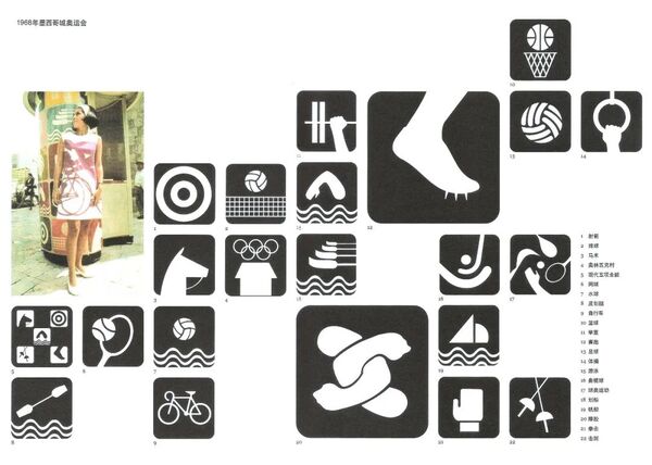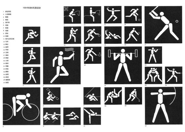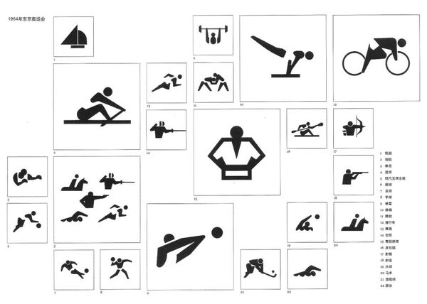 1964年的东京奥运会,开创了奥运会象形图标设计的先河,今天世界范围内再常见不过的体育图标符号便是这届的首创。当时,奥运会首次在亚洲国家举行,面对来自世界各地的不同文化背景的人群,沟通的隔阂不可避免。为了解决这一问题,以设计评论家胜见胜(Katsumi Masaru)为中心,11位年轻艺术家组成的设计团队负责奥运会的体育图标设计。奥运会体育图标早在1936年柏林奥运会和1948年伦敦奥运会就有少量使用,但1964年的东京奥运会,将这种体育图标的设计创建了一个完整的符号系统。胜见胜和其设计团队从奥地利人奥图·纽拉特(Otto Neurath)和吉雨德·阿恩茨(Gerd Arntz)创作的“国际文字图像教育系统(Isotype)”中提取灵感,设计了20个既简洁又美观,并且人人都能理解的标准化体育图标,这种视觉方式极大地方便了来自世界各地的运动员和观众。1964年东京奥运会结束之后,日本奥委会决定将这些图标符号无偿提供给所有的国家,也就是从那时起,每届奥运会都有了不同版本的体育图标设计,不同的国家在这种形式的基础上用各国特色的元素进行延伸诠释。
