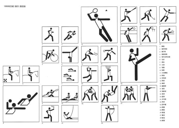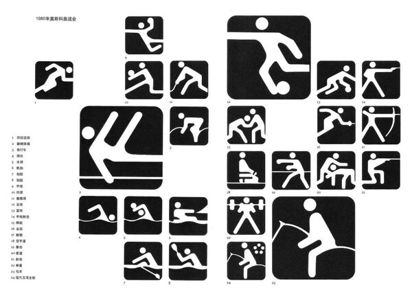 国际奥林匹克运动会的体育图标符号系统是个很好的例子。奥运体育图标是奥运会视觉形象开发的重要项目之一,以简洁、形象、具有代表性的图标语言,清晰的表现出奥运会各个比赛项目的特点。它超越了语言文字在地区、民族间的局限,是一种带有共识性的“世界视觉语言”。它是唯一做的最全面的图标符号,既能让全球的观众理解,又具备申办国的民族和文化特色。在1964年东京奥运会上,日本设计评论家胜见胜(Katzumie Masaru)首度将设计的重点放在了国际标准标识系统的研发上,创造了以图标符号为主的标识系统。这个图标符号系统堪称典范,极大的影响了奥托·艾舍(Otl Aicher)为1972年慕尼黑奥运会所做的设计。他在1964年东京奥运会体育图标的基础上,与其他设计师一起合作研发出一套设计更为简洁流畅的体育图标符号系统。自从1972年慕尼黑奥运会,运动会所涵盖的所有图标符号系统得到了标准化的整体统一。