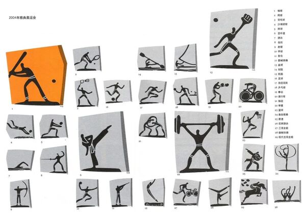 2004年雅典奥运会从三个不同的元素来映射雅典数千年的历史。一个元素来源于古代的花瓶,在花瓶上以典型的方式绘制了橙色背景上的黑色人物图形。另一个元素是大理石雕像对于运动员人物造型的影响。第三个元素是以文物花瓶碎片作为图标的背景轮廓,打破了以往方形的格局,并且每一块的造型都不一样,与内部的人物图标相协调。这三个元素充分体现了设计师对于古希腊罗马时期的文化溯源,也是对雅典文化的一种致敬。