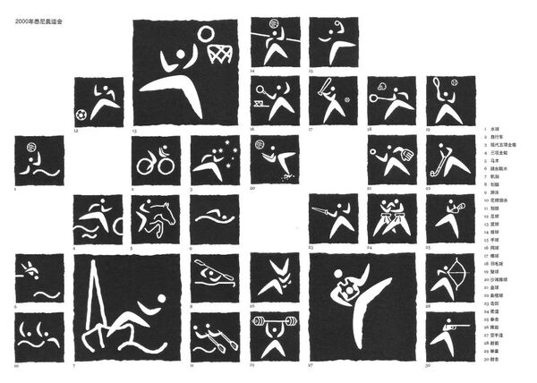 继亚特兰大奥运会上使用了自然写实风格的图标之后,在悉尼奥运会上又一次使用了抽象化的图标符号。同巴塞罗那奥运会的图标造型原则一样,人物形象由头部、上肢和下肢组成,省去了躯干部分。借鉴了澳大利亚当地土著人所使用的飞镖造型,构成人物的上肢和下肢,两条腿构成一个整体的大飞镖,而胳膊则分开为两个小飞镖。这种具有举办地国家特色的形式语言使得图标符号的信息内容更加丰富,也更具文化内涵。但其缺点是飞镖的角度导致了灵活性的丧志,个别图标中的人物动态显得僵硬不自然。