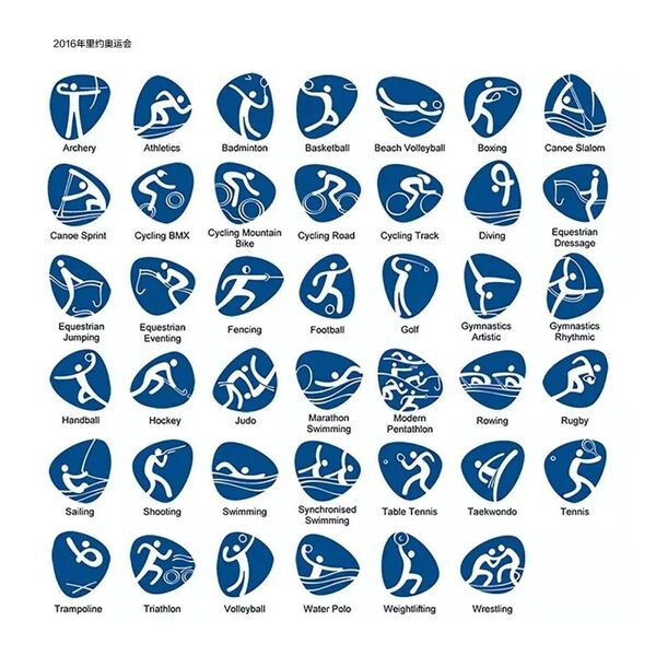 2016年里约奥运会体育图标以圆滑的鹅卵石作为背景呈现运动人形的剪影,栩栩如生、跃然纸上。2016年里约奥运会将采用全新的独特的图标系统,其中包含有 64 个经过精心设计的图标设计样式,分别包括 41 个奥运会和 23 个残奥会的专用图标。每个图标都需要设计师对运动员动作的高度精炼和抽象概括,看似简单却并非易事。里约这套图标的设计优势是增加了一个空间,就是让运动本身有了可以突破的边界,表现张力上确实有优势。让你觉得所有运动都在冲破这个空间,静止的图标有了运动感。是形体与类别、比例与肢体、运动与空间的一次简化。图标符号在线上UI体系里也是个不可或缺的部分,是一套出色的具有世界级水准的图标系统。