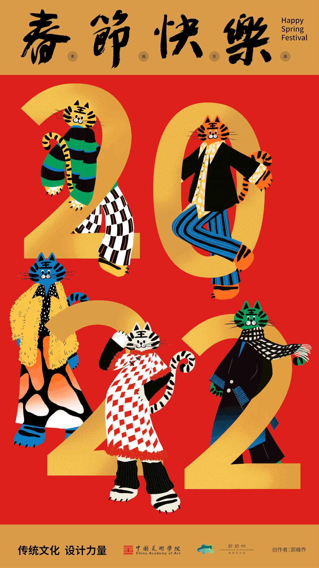 新春伊始,许多中国家庭都会在家门口贴上对联,以表达对新年的美好祝福。该作品以此为灵感来源,取“寅春”和“迎春”的谐音,表达迎来“寅”年的美好祝福与愿景。通过“寅”、“春”和“2022”之间的字形变化,展现春节写春联的传统习俗。祝大家新的一年吉祥如意,“迎”、“寅”、“赢”、“盈”!