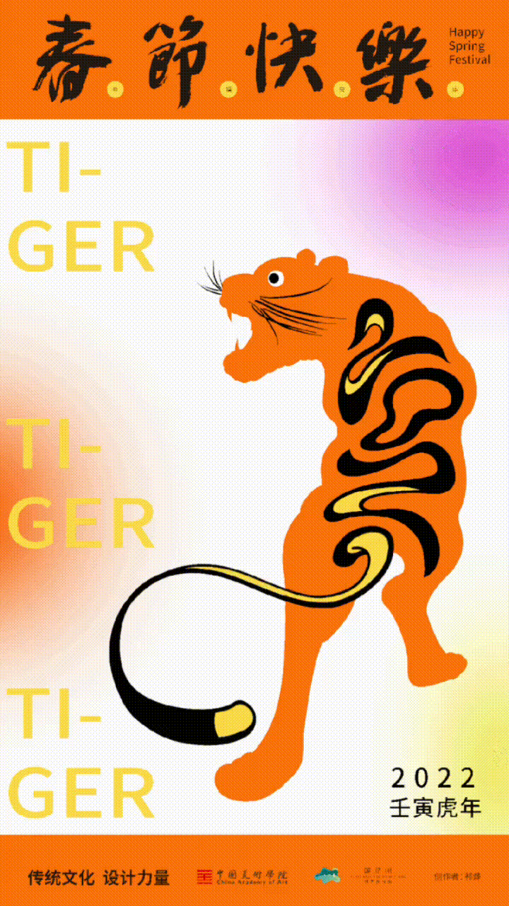 2022年是中国农历壬寅虎年,作为深受中国人民喜爱的生肖形象之一,虎有着勇猛威武、高尚威严的独特气质。谈到老虎,浮现在脑海中的便是那极具鲜明特色的纹路,因此海报将虎纹与“虎年大吉”四字相融合,使字体形如虎纹,流畅的线条也饱含书法韵味。在动态呈现中,海报如同春联一般悬挂坠下展开,旨在传递新春节日氛围,祝大家虎年扬虎威,新年源新意。