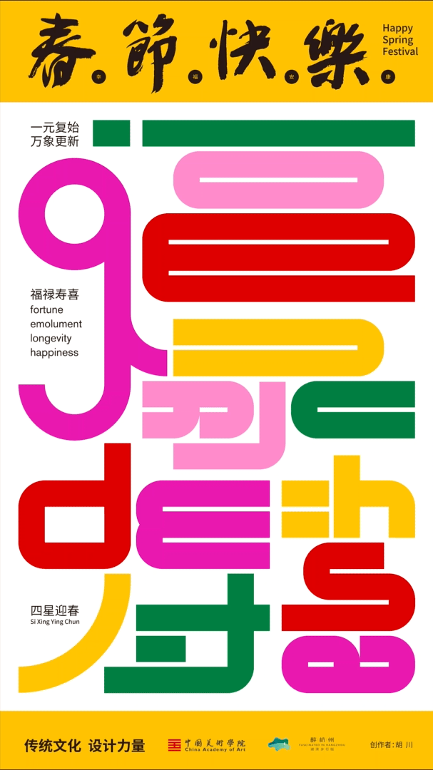 福禄寿喜是中国民间传统信仰的四位星官,象征着健康长命、幸福快活、吉祥如意等蕴意,反映了百姓朴素的幸福观。在全球文化日渐交融之际,海报将这种美好祝福以双语的方式表达呈现。海报设计中,将汉字与英文字母结合,并通过动态演绎的方式实现吉语中英文切换的效果,以此向全球人民传递新春佳节的美好祝福。